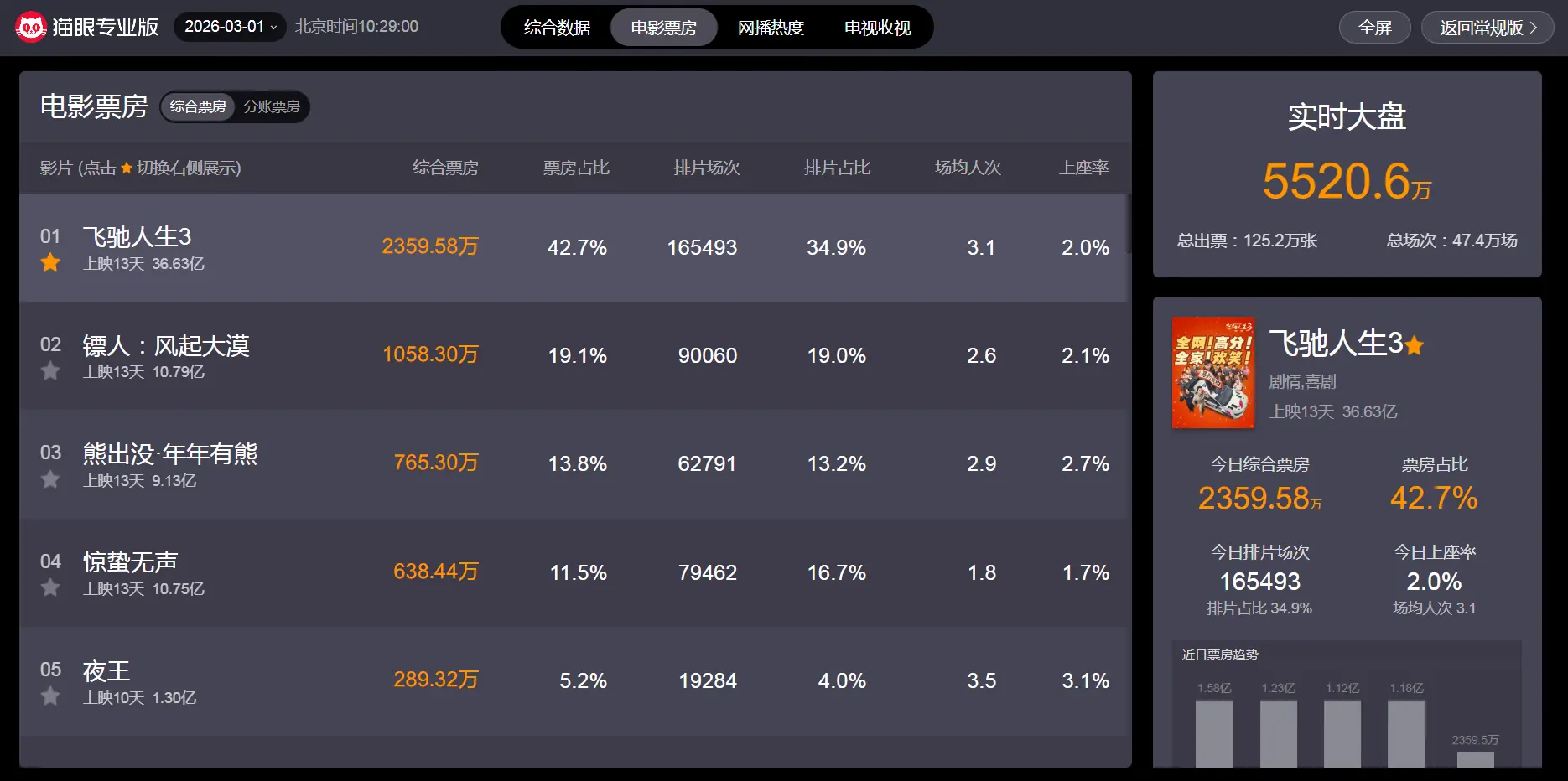 截止3月1日10时29分,从“猫眼专业版”实时数据显示可知,当前热映电影中,票房榜前五分别如下: